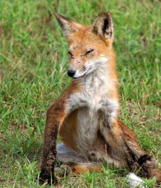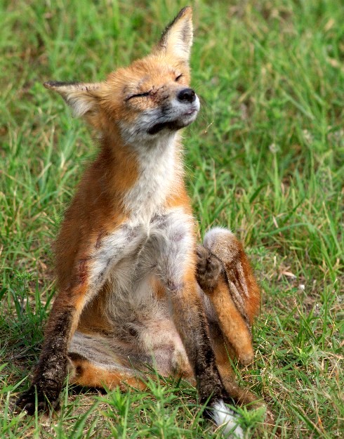The Dog Days of Summer. Some songs are sad. They still need to be written and sung. This male Red Fox is suffering the agony that the heat and insects of mid-summer can bring.