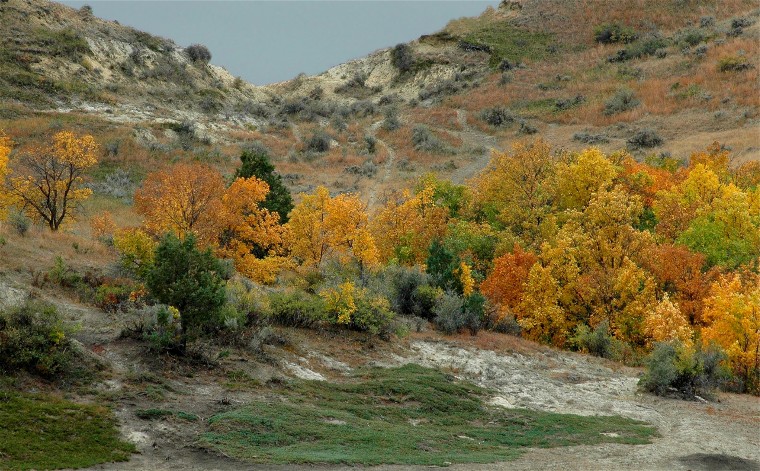 While the eastern half of North America is indeed spectacular during this season, those of you who live out west know that you have plenty to brag about as well. Anyone who has been in the Colorado Rockies on a sunny day in fall with all of the aspen trees in full color know what I mean. Blend those golden aspens with dark green pine trees and snow-capped peaks and wow! I have chosen some more subtle images. The top photo of fall aspen and a mountain was made along the scenic Chief Joseph ByWay of western Wyoming. Our second picture of Western Cottonwoods and hills was made in western North Dakota in Theodore Roosevelt N.P.