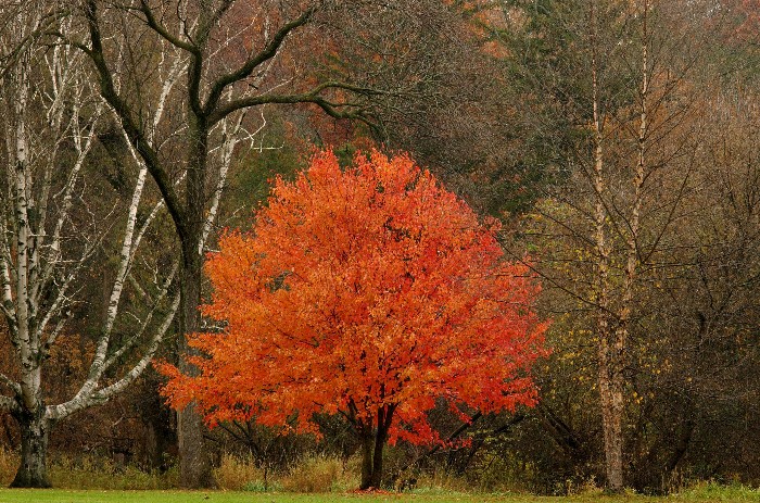 While I begin my fall photography with the first blush of color, I do not finish until long after the trees are void of any leaves. My favorite happening is to find one last tree refusing to “give it up” and lose it’s leaves. A different version of the image below has been featured in a print entitled “Tenacity….Autumns Last Stand” A tree as stubborn as the photographer that took her picture. The contrast of the bare naked trees and the one tough tree willing to try to take its coat into winter, is both a figurative and literal thing. The literal part will determine how you make your compositional decisions. The image was made right here in Southeastern Wisconsin.