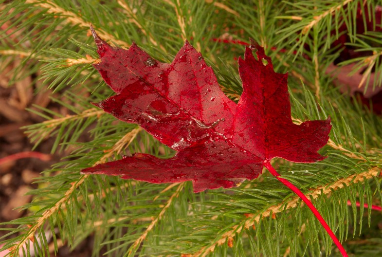 I have taught many workshops in fall. I have also worked fall with many other photographers. The one thing I have never understood is why people do not want to look down in fall. I find it to be as good of a macro season as is spring and summer. Autumn up close is an inspiring sight. Small intimate landscapes are everywhere during this seasonas well as macros. Note the 3D effect of red on green in these images. I use this all through the fall season. Warm colors such as red, yellow and orange visually advance within a 2D picture. Cool colors such as blue and green recede. That separation allows for an eye-popping image. Sunny day images with warm colored trees also works well in producing this very natural result. I do use this on sunny days but much prefer to work most of autumn in the low contrast, heavily saturated light of cloudy days.