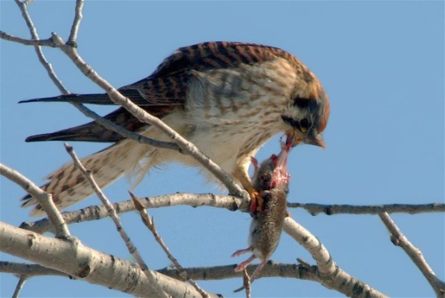 As much as I appreciate the art of nature photography the story telling photojournalist side is even more important. That includes the more gruesome side of nature. For every predator there will be prey. This female American Kestrel is enjoying an afternoon snack of mouse meat. I have digitally removed two branches from this photo so the viewer can have a better view.