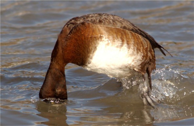 I always enjoy catching (photographically) diving ducks in the process of diving. I usually start a new season of diving duck photography during our long winter. The divers like to use our Lake Michigan harbors until winter’s cruelty freezes them out. Every year my first pictures show nothing but a water circle where my feathered friend had once been. Then come a few feathers sticking out of the water. Then half of a body. Eventually I get good at catching (again, photographically) the duck at almost any position I want. I liked the pose below of a female Greater Scaup.