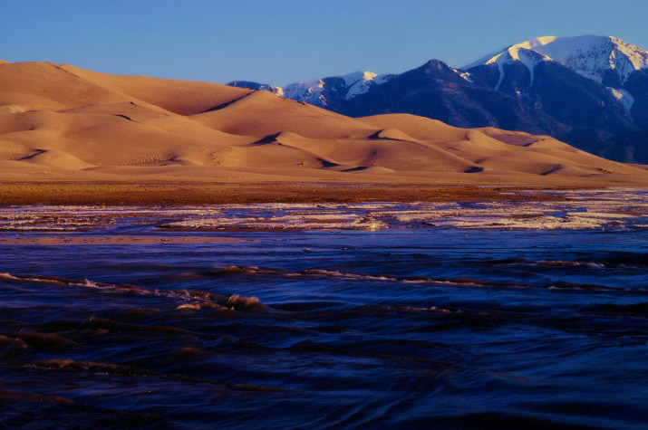 Way back when I lived in Colorado I started out in the dark one morning for Great Sand Dunes. My car broke down! After moving back to Wisconsin, I made the decision to take a photo trip to my former home and also to begin with Great Sand Dunes. I arrived in the afternoon and made a shot (6×7 with film) of the football field wide mountain snow-melt, the dunes, and the mountains. I set in for my long wet walk through the water to the dunes. Immediately the clouds set in. The lighting rendered the sand without detail. I hiked the dunes for pure enjoyment and headed for my car. The next morning I was back again before sunrise and once again made my wet hike through the river of snowmelt and onto to the giant dunes. The light was nice! I found a good spot and set up my equipment just in time to make exactly two pictures before the detail killing clouds returned. One of those images is below along with the picture I made on the first day.