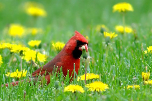 One of my first bird images ever published was that of a male Northern Cardinal. I have shown dozens of Cardinal images since with most showing a lot more bird detail than this one. Still it is a unique shot as our friend “hunts” for seeds while it roams a field of Dandelions.