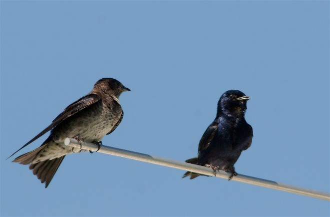I caught this happy couple of Purple Martins enjoying the sun one summer morning. The females (left) are much easier to photograph than the shiny males.