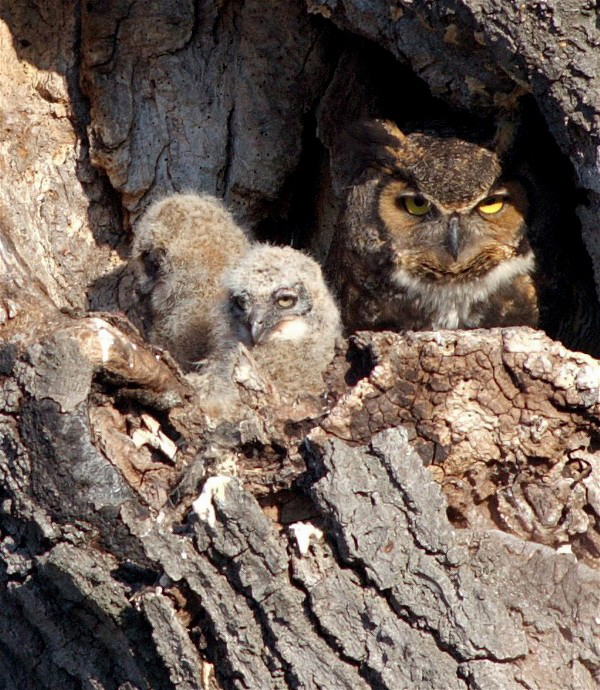 For several years running the annual event to signal the start of the bird nesting season was a matched pair of Great Horned Owls once again raising babies in the cavity of an old tree, as you see below. It is very satisfying to spend time with a wild family right through the fledging process. I definitely miss this owl family.