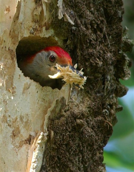 The two most common woodpeckers in southeastern Wisconsin were (are) the Downy and the Red-bellied. The male Downy in the top photo was having a great time placing bird seed in the crevices of this wood and then cracking it open. The male Red-bellied is busy excavating a new nesting hole in hopes of finding a lady WP to join him in the family life.