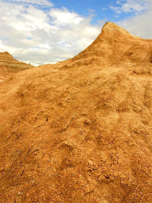 From The Badlands (below) to Arizona and the southwest, texture is the secret to rock & earth images. The most common (me too) way to show texture is through the use of extreme side lighting. The light will skim the surface of the rock or dirt, hitting the high points and causing shadows to fall alongside those points. This will translate into texture in your photo. When I used to shoot film I would carry a roll of Kodachrome 200 in my bag alongside my normal Velvia 50. The faster Kodachrome was a pretty film but very grainy. That grain would translate into texture in the finished picture. Below a large cloud blocked my side lighting just as I was about to make this picture. When I got home I sharpened the rock area of the photo in Photoshop even though it did not need it. The resulting effect was to create some noise which simulated the grain of K 200. The more things change the more they say the same.
