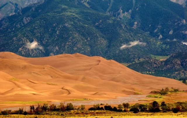My decision to make a telephoto shot of Great Sand Dunes in Colorado was partially made for me by the weather. Heavy storms and flooding the night before made it difficult to actually hike the dunes. I had been on the dunes before so I made a decision to sandwich the 700 foot high dunes with the mountains in the background. My translation of the language of nature was a story telling shot of these strange (for the high mountains) but beautiful sand dunes.