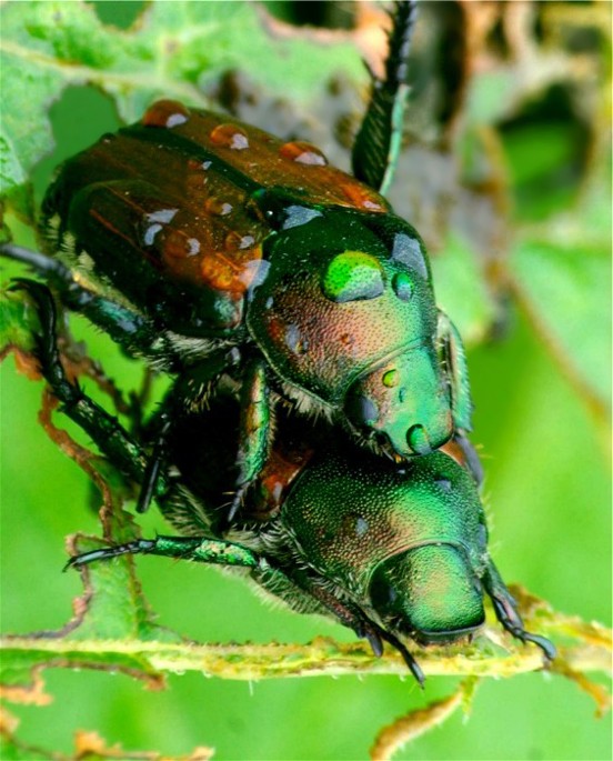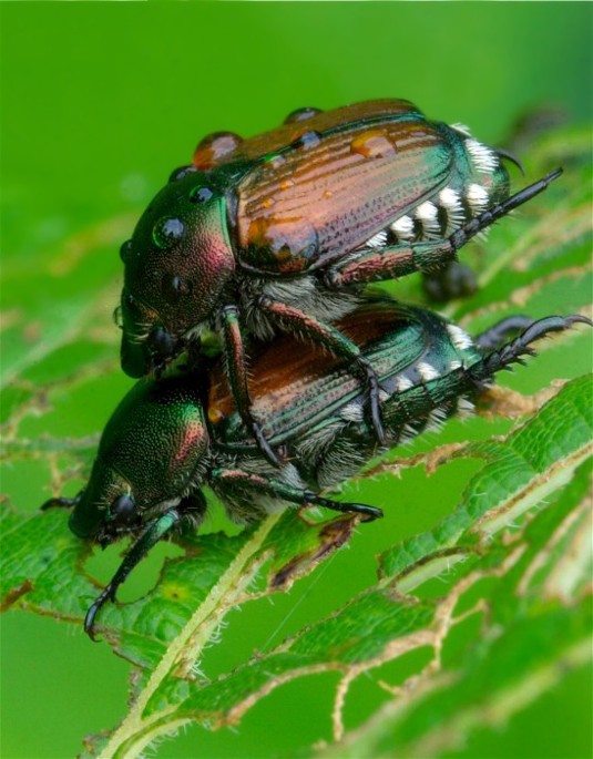 These Japanese Beetles clearly had a romantic evening the night before I made this picture. It is also clear that they fell fast asleep in this position and even collected some dew overnight.