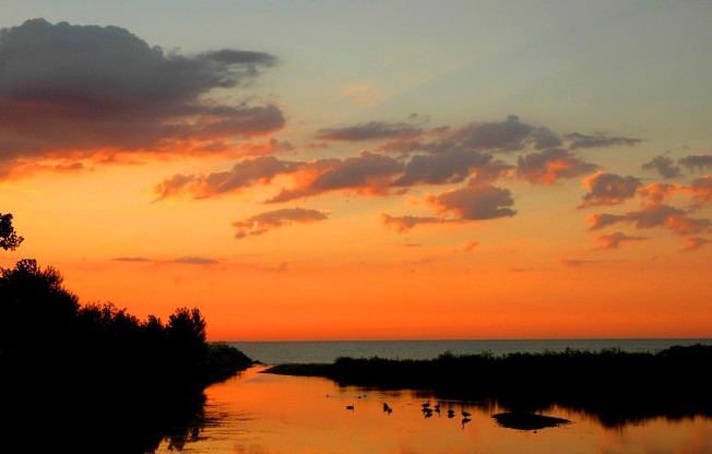 Small Lake Michigan bay and Canada Geese at sunrise. Shots like this are always nice and they are also easy. Photography 101. This image is a wide-angle shot (about 40mm) and I used manual spot metering, taking my reading from the brighter clouds. That is the mid-toned section of the image. That left me with a picture basically as my eyes saw it.