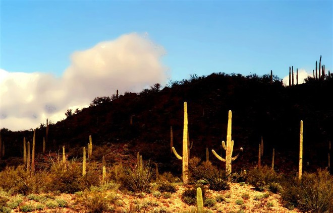 Late afternoon shadows in the desert. When shadows in a photo fall across areas that we feel the need to see, they can ruin an image. They can however, add drama and sometimes mystery to a scene. In this case they took a rather ordinary scene of the Sonoran Desert and made it more interesting. The sunlit cactus pop out and separate from the shadowy area.