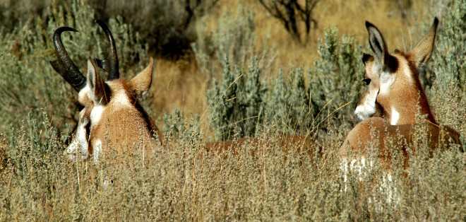 Pop and the kid. This pair of pronghorns is likely the father on the left and one of his offspring. They watched the distant horizon intently. There was supposedly a wolf pack in this area of Yellowstone N.P. just a short time earlier. A good enough reason to be wary.