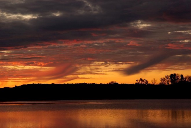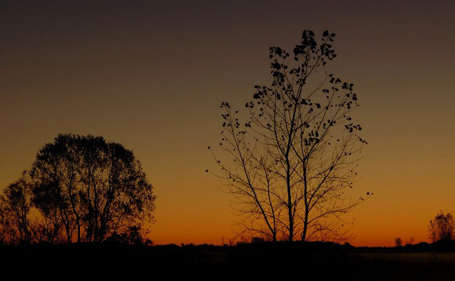 Silhouetting objects is a popular and powerful use of the colors of sunrise/sunset. There is a myriad of ways to do this. The first image is a sunrise of a Utah rock form in The Valley of The Gods and the second shows a couple of trees at sunset on a Wisconsin prairie. Notice that in the Utah image I did not divide the different parts of the image down the middle. I also moved the rock form itself well off-center. Centering your silhouetted objects can be a way to often create a stagnant image. Notice I said it can be. There are exceptions to every rule.