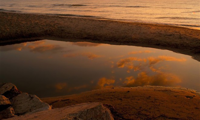 There is certainly no reason that we have to include a lot of land or sea in our sr/ss reflections. I really like making the reflection itself the center of my image. In this case I needed to add a little exposure to the scene because I wanted some detail in the beach and rocks that surround this Lake Michigan tidal pool. I wanted this image to retain some of its sunrise mystery but to still show just exactly where it was made.