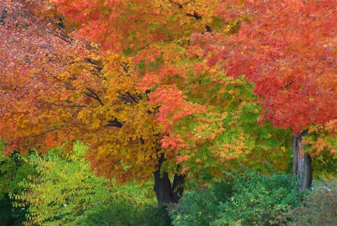 I love the first blush of autumn. I mean that time when you have multiple shades of green, gold and red. The image below was a methodical exercise of placing colors and tones in a fashion that appealed to my esthetics. Those tree trunks were just as important to the composition as were the leaves.