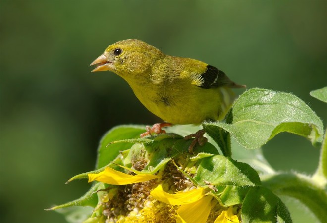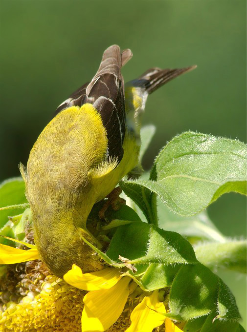 Male (top) and female American Goldfinches harvesting seeds from sunflower plants.