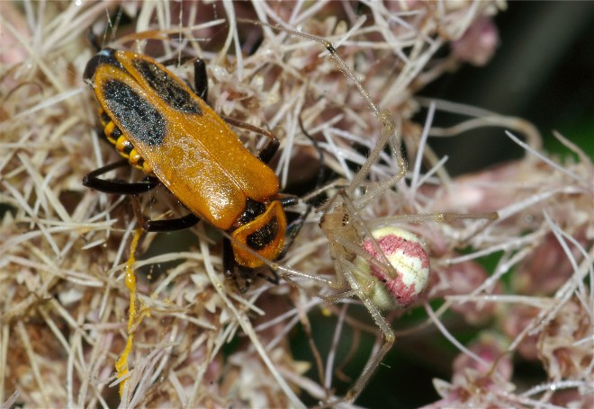 The images below may be a bit confusing to the eye. Joe-Pye Weed photographed up close can be a jumbled mess. The picture shows a Goldenrod Soldier Beetle being eaten by a Goldenrod Spider.
