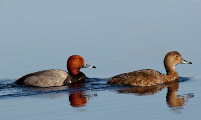 This happy pair of Redhead Ducks were actually swimming along at a pretty quick rate of speed. I needed a fast shutter speed to stop the action as they were moving across the picture frame swiftly. Any F stop would work because they were swimming parallel with my camera back. Very little depth to the ducks with a clean background meant that I needed very little depth for the image. That meant I selected shallow depth of field allowing the camera to choose a fast shutter speed. ISO 200, F 5.6, 1/1250 sec., 500mm lens and made from the car with that famous Walmart pillow as support. Horicon Marsh NWR, WI![]()