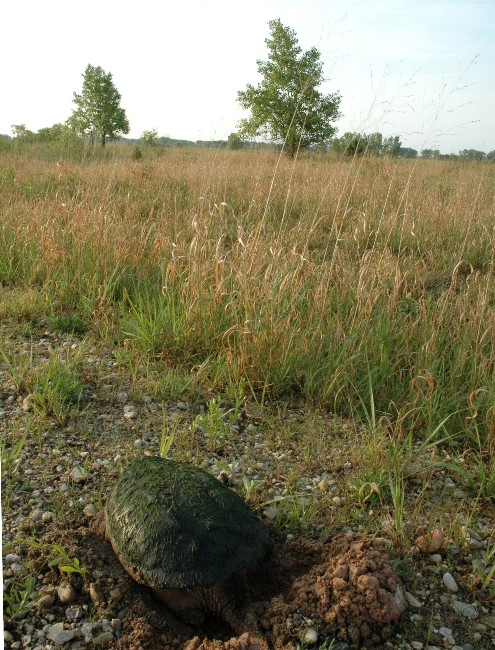 The one snapper behavior that I have a lot of photos of is females digging nests. I work very quickly with these turtles. I do not want to disturb them too much. I think ahead about what I want and can usually get everything, including lens changes in about two minutes. If I feel I am drawing the attention of hikers or motorists I generally move on. Some people will intentionally kill or torture these creatures. If I feel I have drawn attention to the turtle, and it may be with someone who will cause harm, I remain near the turtle, and by that I mean about 50 feet not the 1 ½ foot distance that I sometimes make photographs from. If necessary I will stop people from harming them. This is less of an issue in state parks or nature sanctuaries. Non wooded grassy areas and the shoulders of roads are likely places to find Snapping Turtles building nests. In Wisconsin, early June right after a rain has softened up the ground is a good time for nest making.