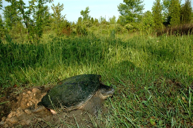 One of the jobs of a nature photographer is to build a photo file that can help tell (and illustrate) the story of wildlife such as turtles. Below you will find a series of pictures of three different female Common Snapping Turtles. This is not even close to giving the complete picture of this species but it does give a nice overview of the snapper. Missing are snappers in the water, mating, catching and eating prey, eggs hatching etc. It takes a long time and a lot of work to truly tell the visual story of any species of wildlife.