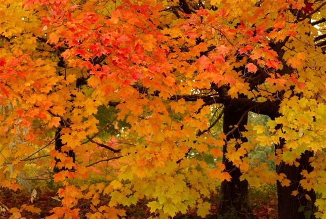 Yes there are tricks that I use to make colorful fall pictures. Just not the ones you might think. My first trick is to look for colorful trees and shrubs in the first place. It is amazing how easy it is to create good nature pictures when you let Ma Nature do much of the work. Using soft light also helps a lot. Having subjects (trees etc.) that are not washed out in the sunshine, and do not have the ugly, spotted contrast issues that come from sun shining into trees, will allow the colors to be saturated. When I am using quiet light I look for colors and tones that have some “inherent” contrast. Cool green combined with warm yellows and reds separate from each other and pop. It is an illusion and it is one I use frequently to make colors appear more colorful. I hold saturation in color a little more than many photographers by using a slight under exposure during cloudy day image making. Deeper tones in many colors will make them appear more saturated. I sometimes use a polarizing filter to kill reflections on leaves and therefore let the color shine through.
