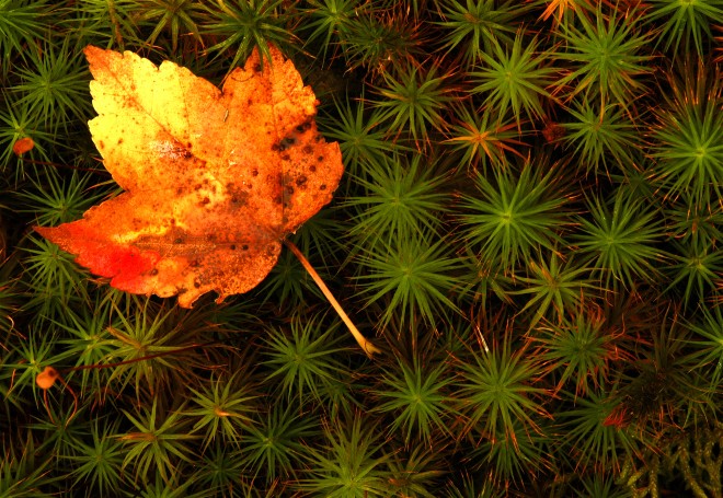 If paying attention to details makes for a better picture, then we have to train ourselves to notice those details when they exist in front of our eyes. I could have just continued to photograph those big and beautiful autumn scenes that were in front of me, but I did not want to miss any details that I might find on the forest floor. This leaf lying on a bed of moss is all about details.