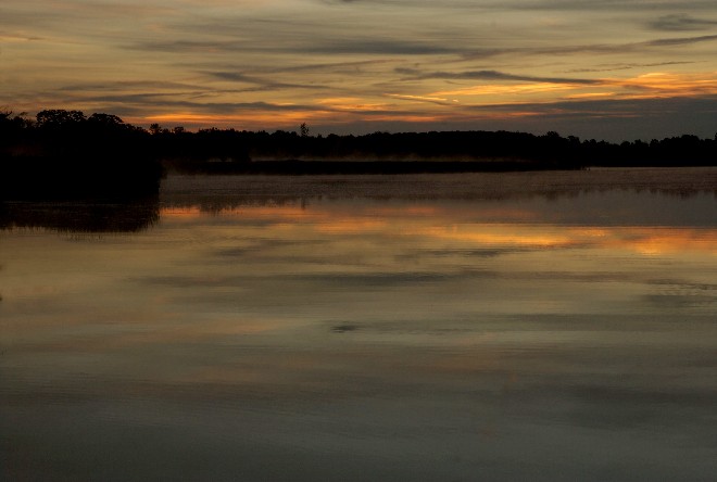 All SR/SS are not high color. I was mostly interested in the calm reflective waters of this small lake and how they mirrored an interesting sky. A few small areas of reddish color were a bonus.