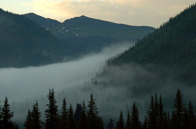 I often write about those special moments at special places and the special morning below high in the Rocky Mts. fits that bill. I drove through the darkness (always scary in the mts.) literally enveloped in clouds. One of the awesome things about being on a road ten thousand feet in the sky is that you are often in the clouds. As daylight began to open its eyes, just enough of those clouds began to clear to show this mountain location. Most photographers today would make this an HDR image. Some would do a great job but many would turn this “nature provided art” into a cartoon. Sometimes witnessing with a camera is more than enough. I can feel the dampness of the clouds, and the thin mountain air as I look at these images.