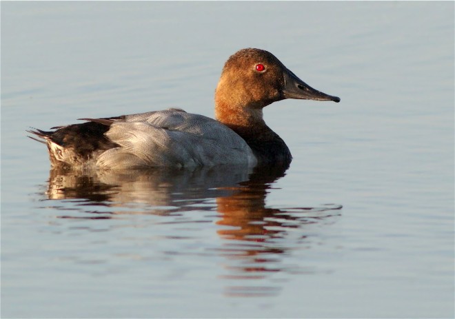 I have known some photographers who were new to bird photography that struggled with and ID between the male Redhead Duck drake, the male Canvasback Duck. Unfortunately I would have to go back to my slide files to find a shot of a Canvasback that is not in molt but I think the image I included will show the difference in head and bill shape, as well as eye color.