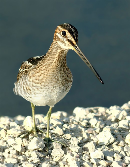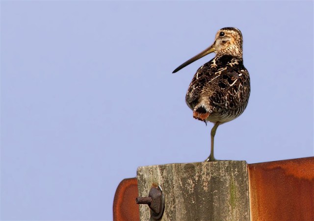 The Wilson’s Snipe was recently recognized as a different species from the Common Snipe. The two snipes are similar in appearance but they have a different number of tail feathers and they vary a little in their neck patterns. The “winnowing” sound used by the male to defend his territory and attract a mate, is highly recognizable by those of us who have heard it. It is not a vocal sound, but rather is produced by air flowing over the outstretched tail feathers with each wing beat. The clutch size of the Wilson’s Snipe is usually four eggs. The male snipe takes the first two chicks to hatch and leaves the nest with them. The female takes the last two and cares for them. Apparently the parents have no contact after that point. The nest is made of neatly woven grasses and should be close to water.