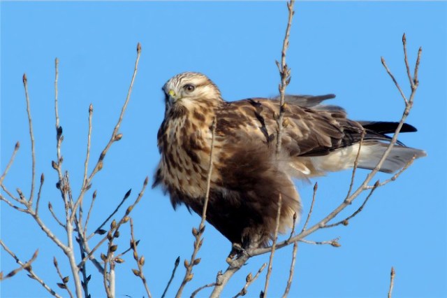 The Rough-legged Hawk is a wonderful visitor to Wisconsin from the arctic north. Many of the RLHs that I have found were willing to tolerate me in my car as very close range. I have also gotten out of the car and set up my tripod, maybe 50 feet from one of these birds without frightening them away.