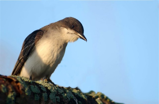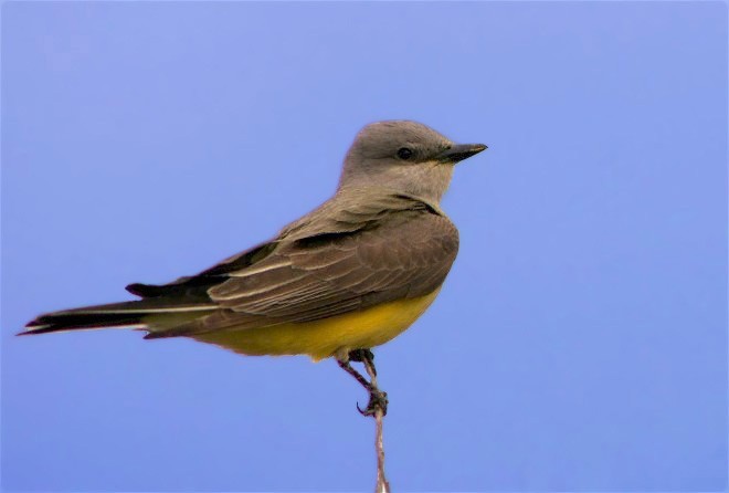One of my ambitions in stock photography was to get the North American eastern and western versions of as many bird species as possible. I have many Eastern Bluebird pictures but (if memory serves me) one single slide of a Western Bluebird. Memory also fails me as to just how good that slide is. I also have many very good shots of the Eastern Meadowlark, but have never succeeded to make a sharp picture of a Western Meadowlark. I have many images of the Eastern Kingbird, but I have actually managed to get a small sampling of Western Kingbird shots. In the case of the Kingbird the western version carries a bit more color. In this “east meets west” encounter below we see the east followed by the west