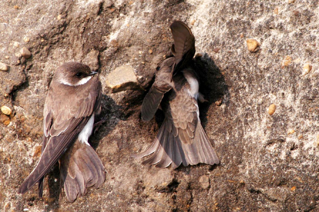 Bank Swallows may be the plainest bird in the swallow family, but their communal nesting in the side of hills is fascinating. This is an old film image. At this location I would sit in my car at the edge of an abandon parking lot. Just to my left was an old pile of dirt that they would use for nesting. In many cases I was at the minimum focusing distance of my lens. I would then switch to a 300mm lens, and then to a 50mm leans. This helped me tell the whole story of the Bank Swallow. In this case one adult is feeding babies while the other observes. The pile of dirt was removed a few years ago but there is another site in this area.