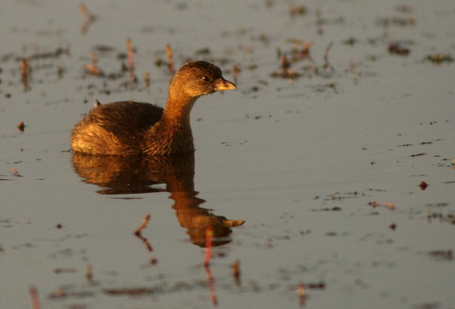 Pied-billed Grebe at sunrise. Now a days I will from time to time share an image that might have a bit of a disturbing background. I found the light on this little bird to be pleasing so instead of burying it in my files because of the background….here it is.