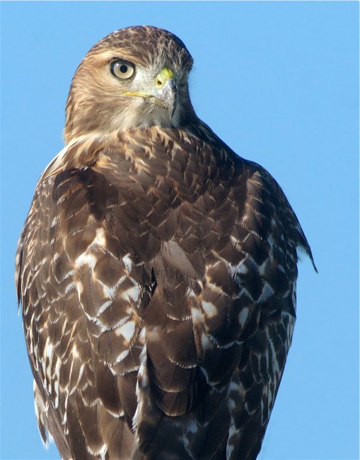 A close-up visit with a red-railed Hawk. It can be amazing how these guys can turn their heads 180 degrees from front and center.