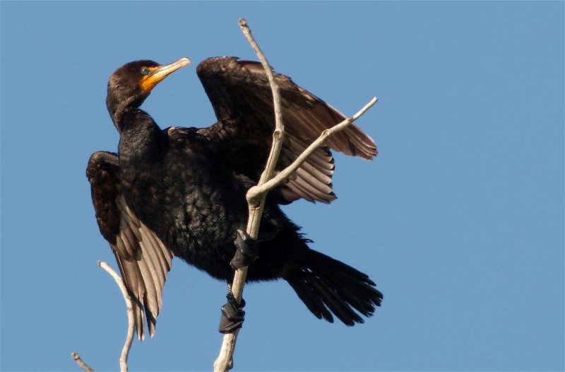 This picture of a cormorant, was made when I was a bit further from my subject than with the swallow. That is fairly obvious because this is a bigger bird. This image is a crop but not a large one. The late morning sun is coming over the right shoulder of the bird. That creates shadows and some obscure details on parts of the bird, but it also makes bright highlights that separate themselves from those shadows, which makes this a nicely detailed image. I made this picture at f5. I needed less dof because the bird was farther away from me. My dof was actually not a serious consideration when I made this image for two reasons. Firstly because, once again this bird is spread out almost parallel to my camera, and secondly the background is perfectly clear, and therefore it will not subtract from my clean and simple image at any f stop. In other words, no background detail exists. F4 would have produced a bird that is sharp throughout, but f22 would yield a clean background. I had plenty of options when I was making this photo.