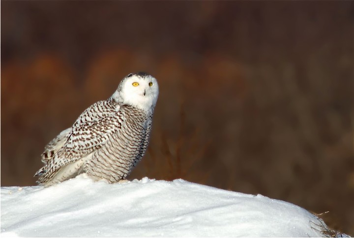 The third photo is that of a Snowy Owl and this is an extremely distant shot. I have made a major crop here for my finished image. There is a lot of atmosphere between us and the owl. When you are focusing manually it can be very hard to get an “in focus image” when your subject is a long ways away. One reason being, that it is difficult for our eyes to discern details at that distance. Picking out details, those differences in tone and apparent texture, is how you or your camera focuses. It is less obvious at a distance. I sometimes use an aperture with more dof at a long distance than up close, so to correct for any mistakes that I or my camera may make in focus. I made this image at f8. I hoped that if I missed my focus a tiny bit, f8 would carry enough dof to cover that mistake. If I was sure of my focus, I would have shot at f4 with this much distance. That would have killed any detail at all in those winter trees in the background, and made my image of the Snowy more simple and pure. As it is, it did keep the background detail just soft enough to be a usable picture. I should also add that the background showed some disturbing camera noise. In the editing process I removed some of that noise which did help to make that background less disturbing by softening it. Trying to gain detail in a bird while you attempt to keep detail at a minimum in the background, is a difficult but rewarding exercise.