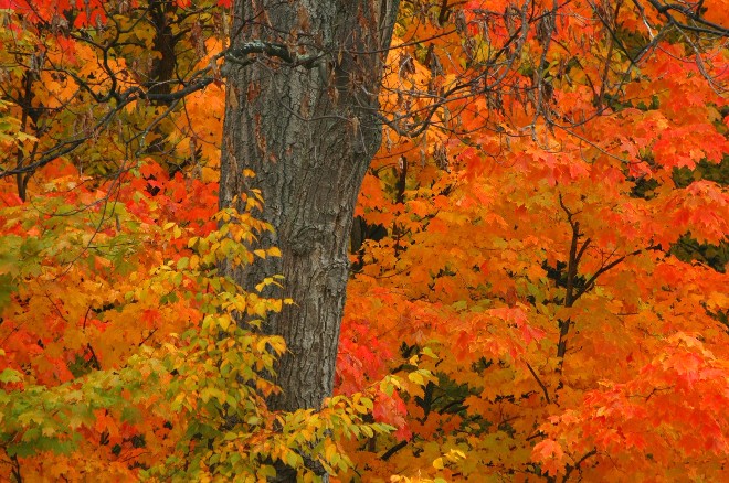 Cathedral: It’s always good to find a variety of ways to look at a potential picture. This forest was heavy with trees and confusing to the eye. The sunny day provided way too much contrast for one of those color dripping low contrast fall images that I love so much. Shooting up is not only a pretty cool view, but the autumn colors and blue sky provide pleasing contrast, while eliminating ugly contrast.
