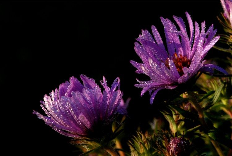 Autumn Flower: The fall season does still mean some wildflowers, and the New England Aster is one of our most common. As I often do (or dew) I look for flowers covered with water, and if possible, an interesting point of view. Some deep shadows to make the flowers pop, doesn’t hurt either.