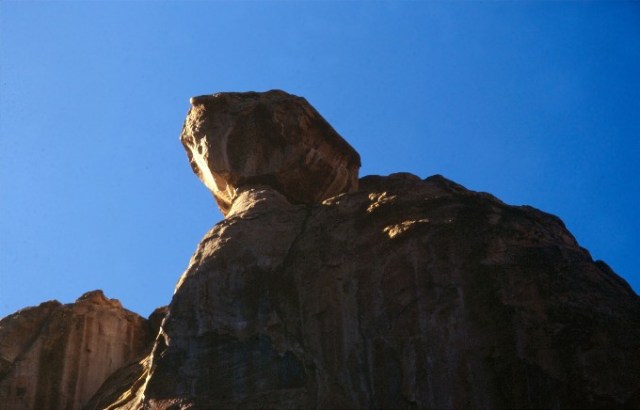 This rock form is at El Morro National Monument in New Mexico. Sometimes difficult light conditions make for interesting photos. When you look at the front of the peak of the rock, you can see that this image was made with extreme sidelight. I balanced this old film image as best I could by using a separate hand-held 1% spot meter. I took readings from the highlights and the shadows, and computed a compromise exposure. I like the unusual lighting conditions in this photo. I could probably “fix” this digital copy in the editing process, but in real life with our real eyes there are sometimes unusual lighting conditions and it is fun to share them