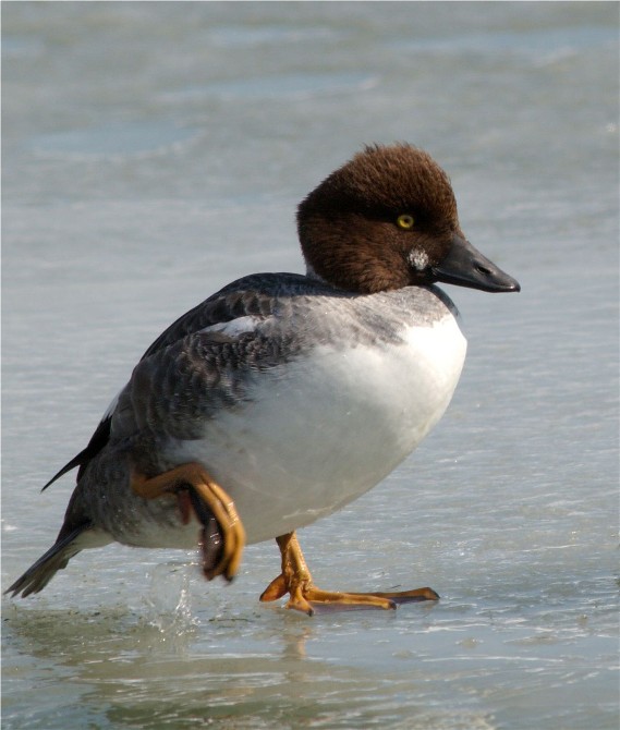 The Common Goldeneye duck is a popular bird among photographers. They are always doing something. This first winter male is making his way across a frozen river here in Wisconsin.
