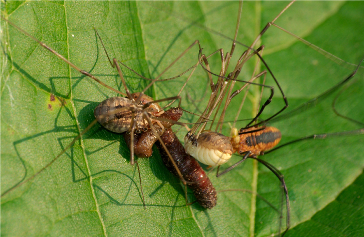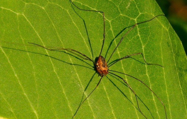 The Daddy-long Legs is a common little critter to find on the face of a leaf. This guy is an arachnid. It is in the general spider family but the lack of two body parts means it is not a true spider.