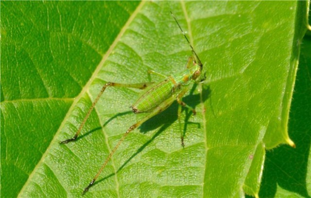 Green leaves provide a lot of camouflage for insects. This Tree Cricket is “hiding in plain sight”.
