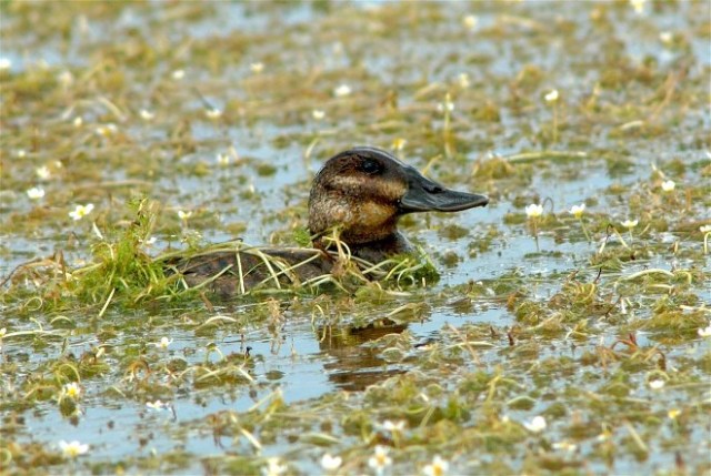 Another fine mess. Caught this female Ruddy Duck in a Colorado pond. Every time she made a dive she would return with pond weeds all over her back. I liked the shot but my hope was that sooner or later her head would have a few strands attached. It never happened. The plants you see did not prevent her from flying.
