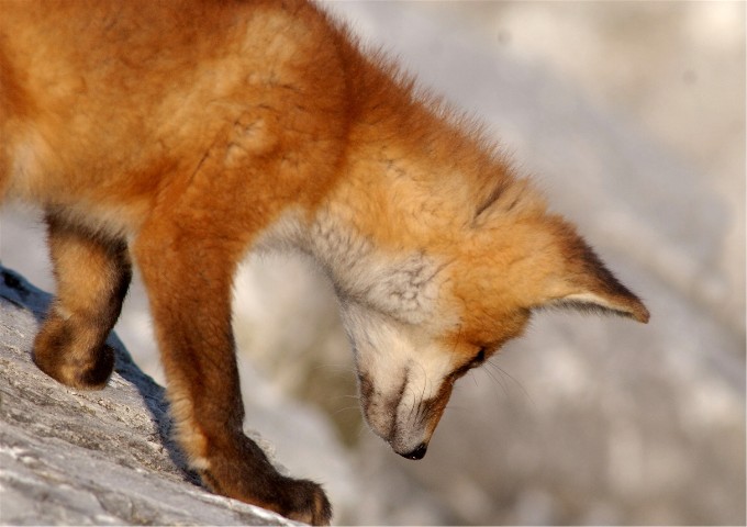 There is nothing more satisfying than when a wild animal completely accepts you. This kit wandered around the rocks for a while, stopped, stared at me once, and fell asleep a few feet from me. Adult foxes usually will not stare us in the eyes, for fear that we will take that as an act of aggression, or a challenge. Really young kits rarely stare because like most babies, they don’t even know what you are. Older kits like this one will occasionally focus on you. Please note that I did not approach a fox that had laid down to sleep. I photographed a fox that had decided to lay down close to me.