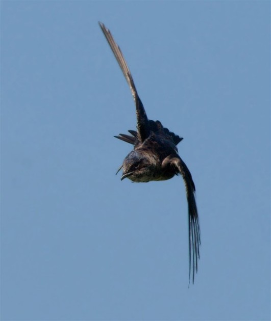 A female Purple Martin coming at you. P Martins are our largest Swallow.