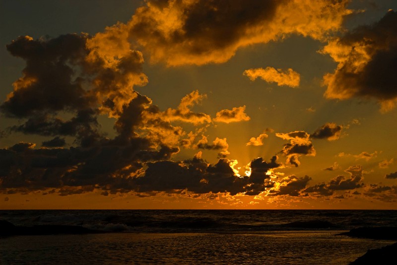 Dramatic sunrise clouds cover Lake Michigan and the Pike River.