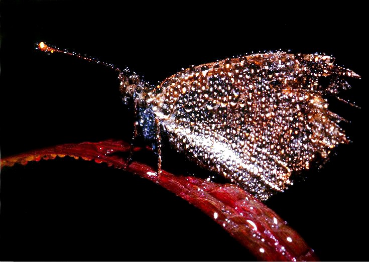 This is a very old slide image of an extremely dew covered butterfly, and is as you can see, a somewhat radical one. You can tell it is a flash picture and that was very intentional. I over used the flash to create a sparkle on every dew drop, and create a black background in order for those colors to pop. I thought a little creative vision was due in this shot. I intentionally did not use multiple flash to light the background. A natural light version of this picture has been published in Wisconsin Trails Magazine as a part of Jewels of The Morning. That was a portfolio of dew covered close-ups of mine that was once published in Trails. The natural version was also published “somewhere” else, but where, currently escapes me.