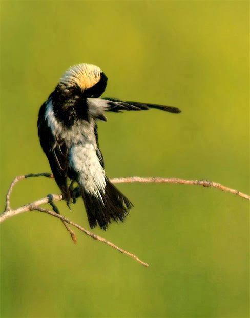 Two of the favorite times of my life were spent sitting in a blind, observing and photographing first Greater Prairie Chickens, and then Sharp-tailed Grouse. We also have Roughed Grouse and Spruce Grouse here in Wisconsin. I have always enjoyed the shots I made of Sharp-tailed Grouse dancing just at sunrise. I think the out of focus washes of yellow, that were provided by other birds, complement this image of a dancing male.